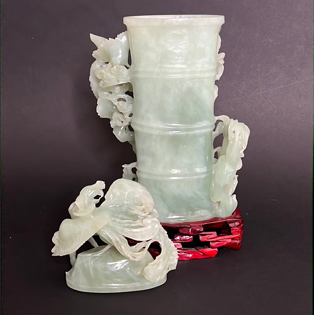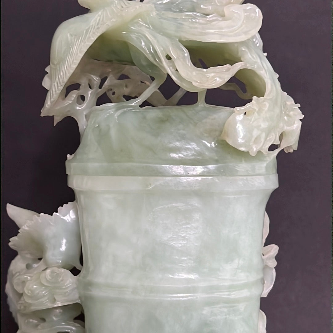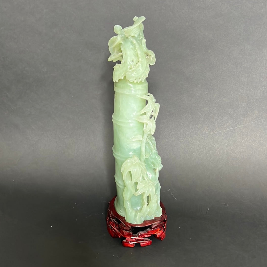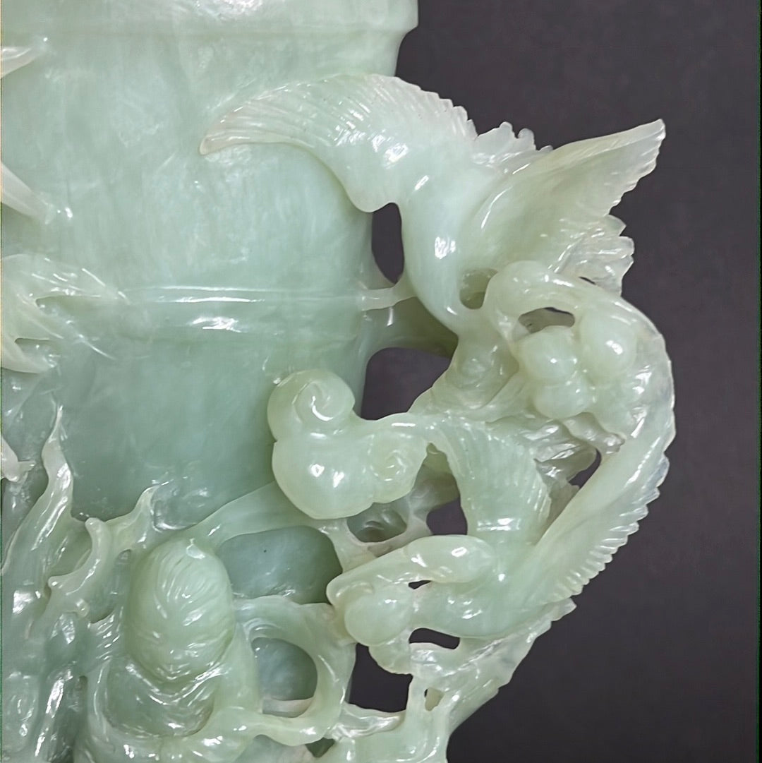 20th C. Celadon Chinese Jade Bamboo Jade Vase With mythical Dragon ,Phoenix & Crane Birds