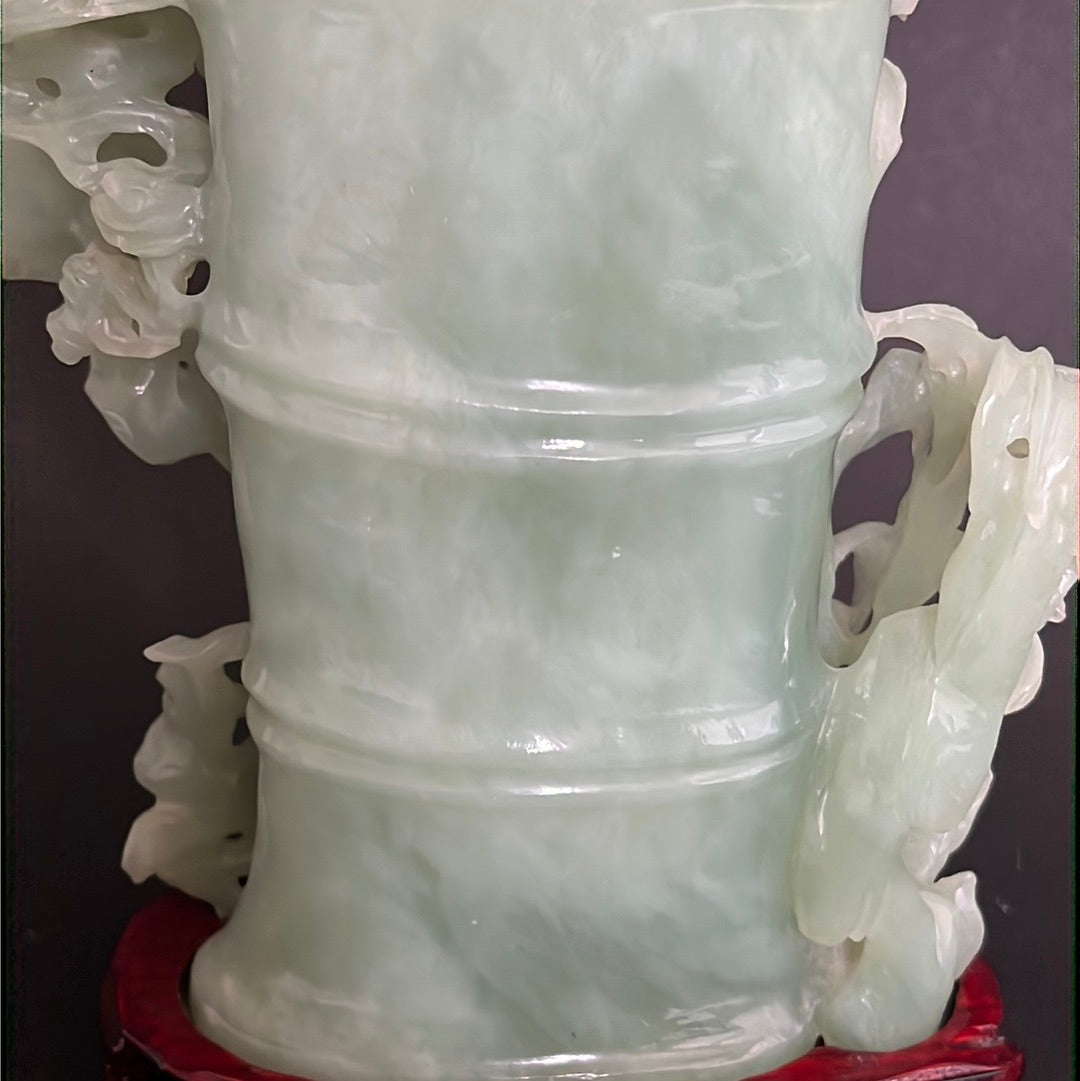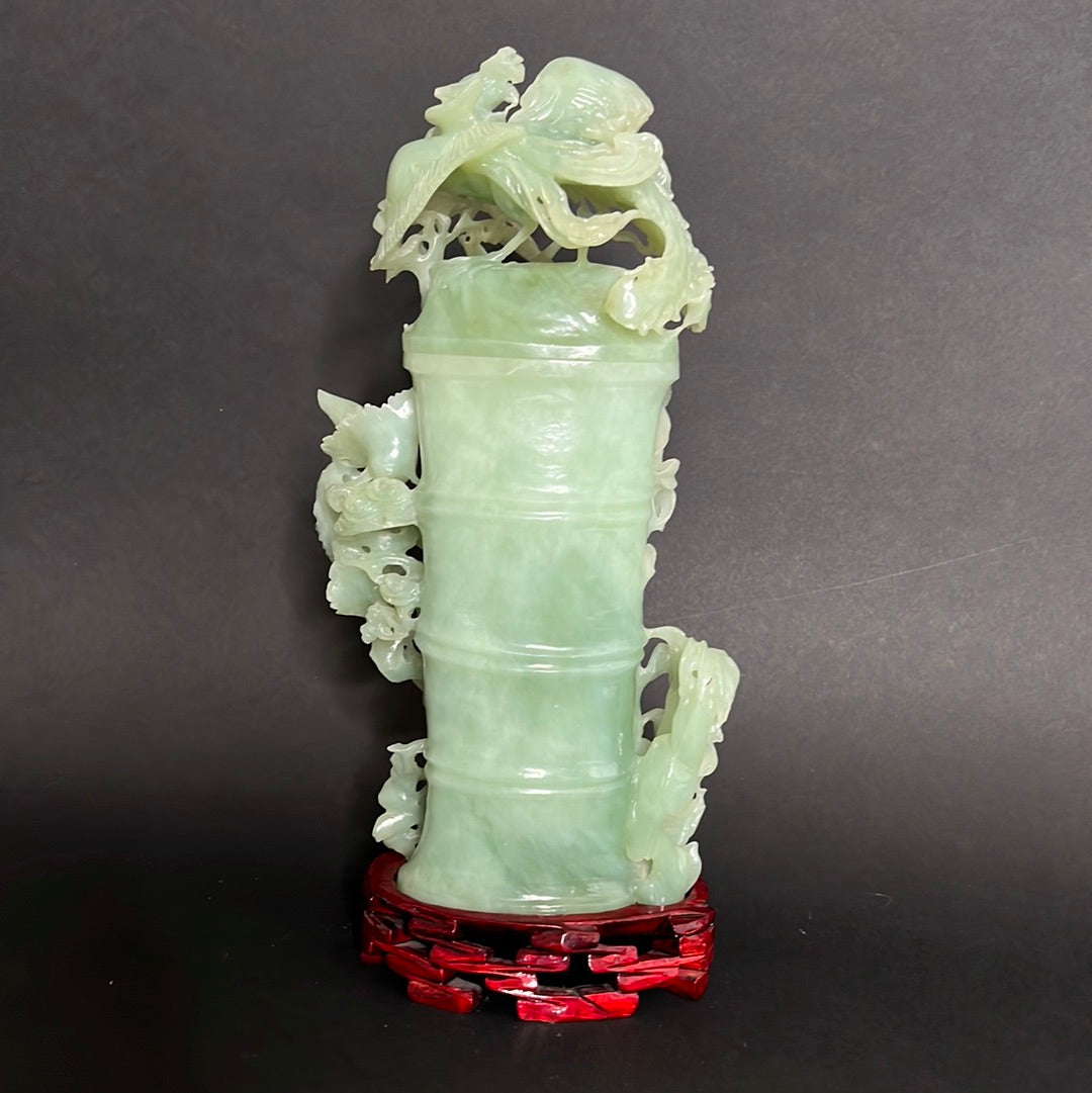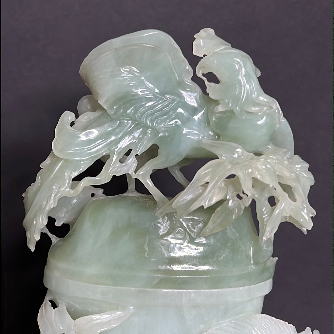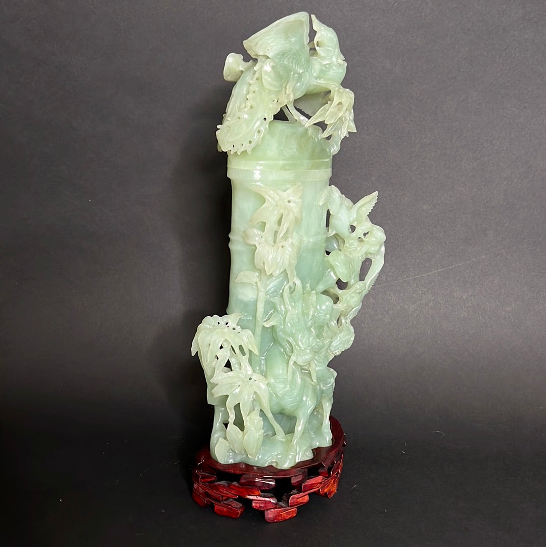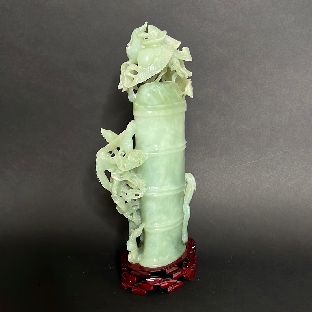 20th C. Celadon Chinese Jade Bamboo Jade Vase With mythical Dragon ,Phoenix & Crane Birds