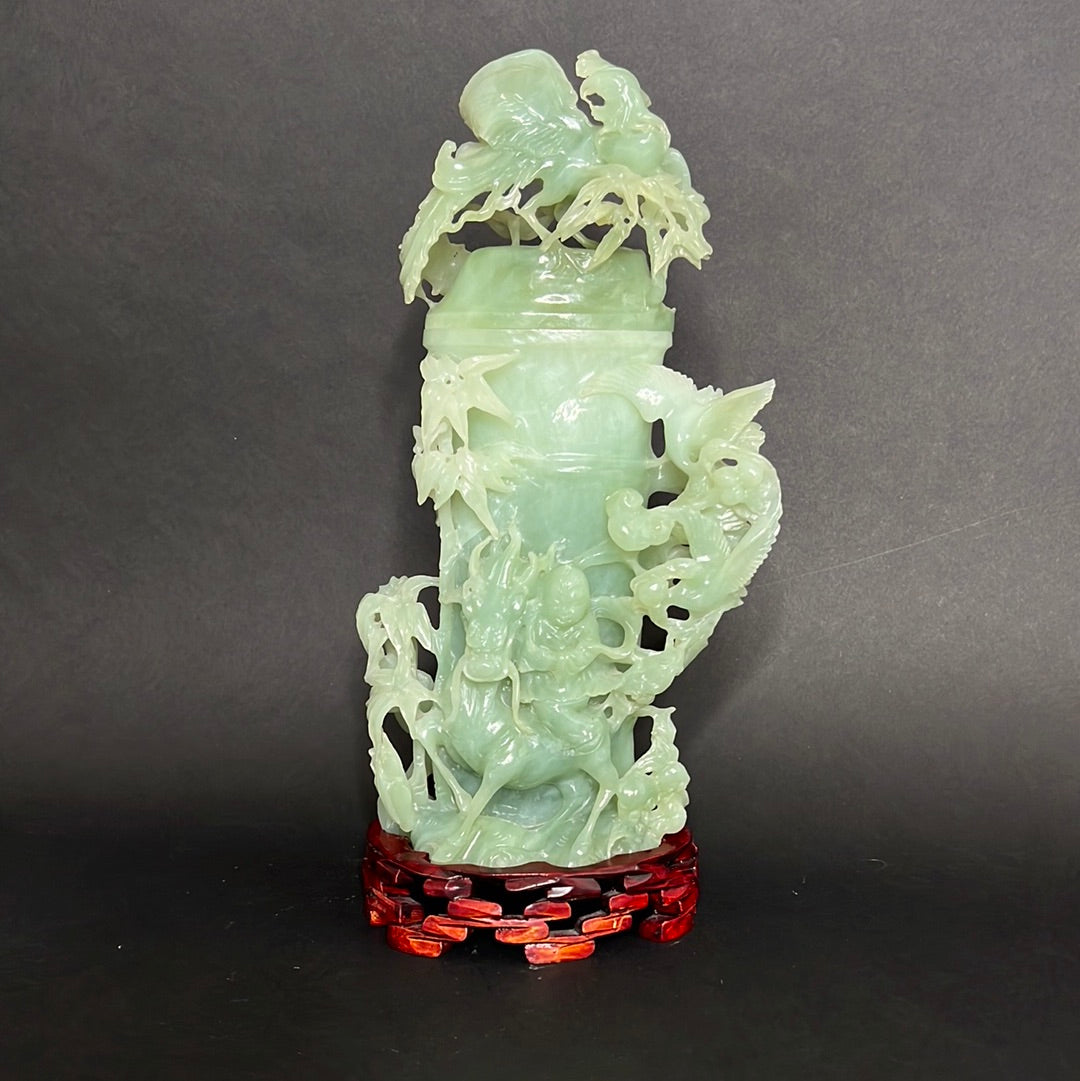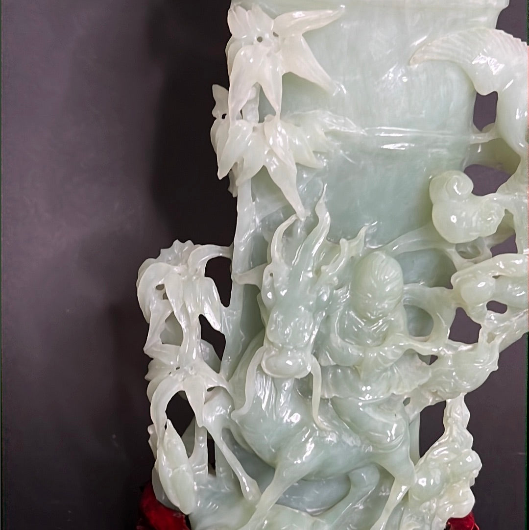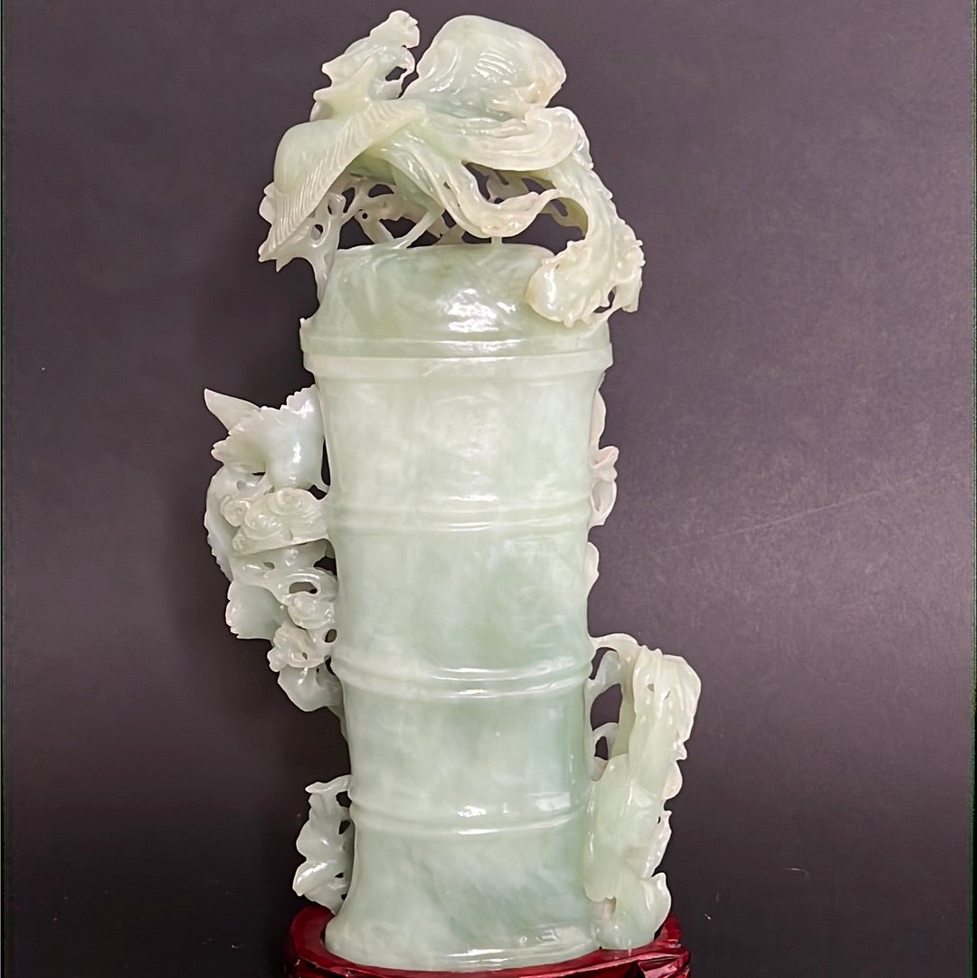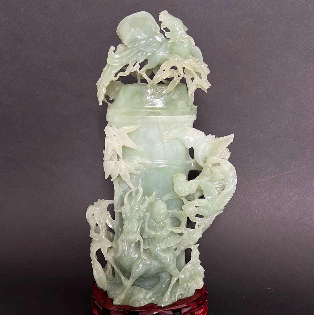 20th C. Celadon Chinese Jade Bamboo Jade Vase With mythical Dragon ,Phoenix & Crane Birds