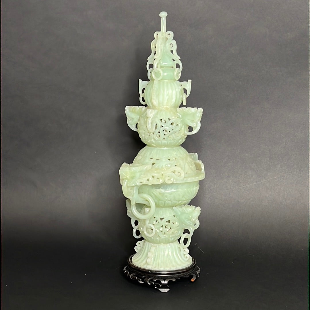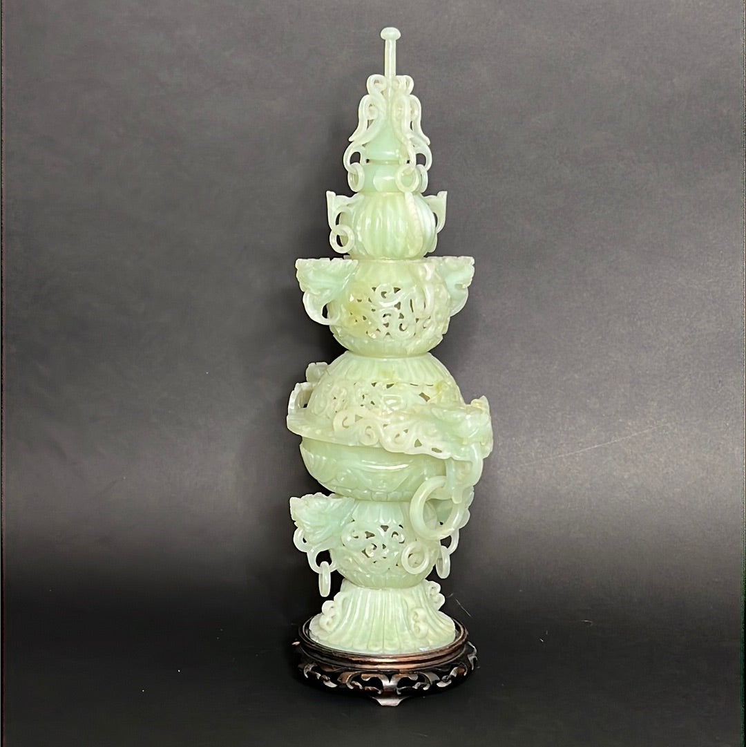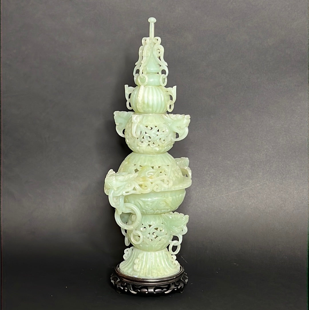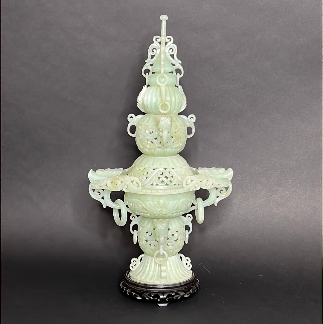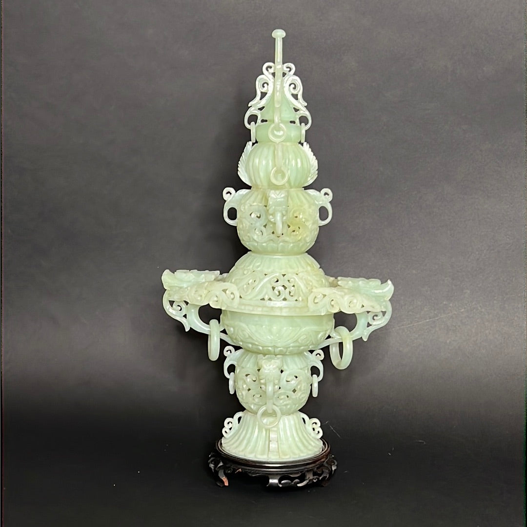 20th C Celadon Russet Jade Exquisitely Hand Carved Pagoda Tower