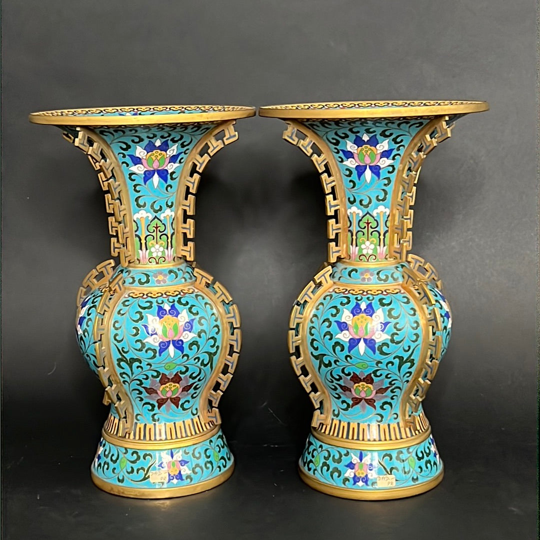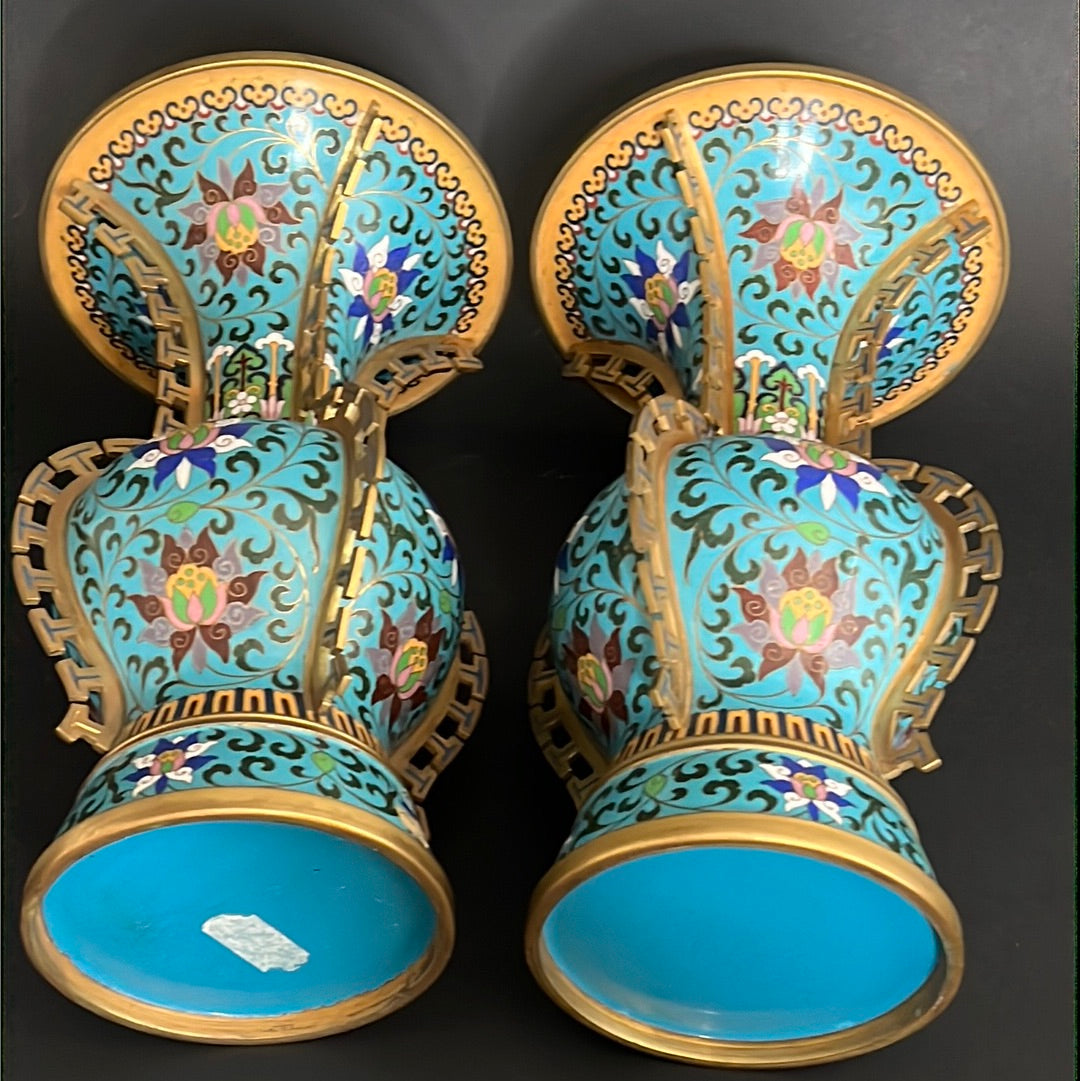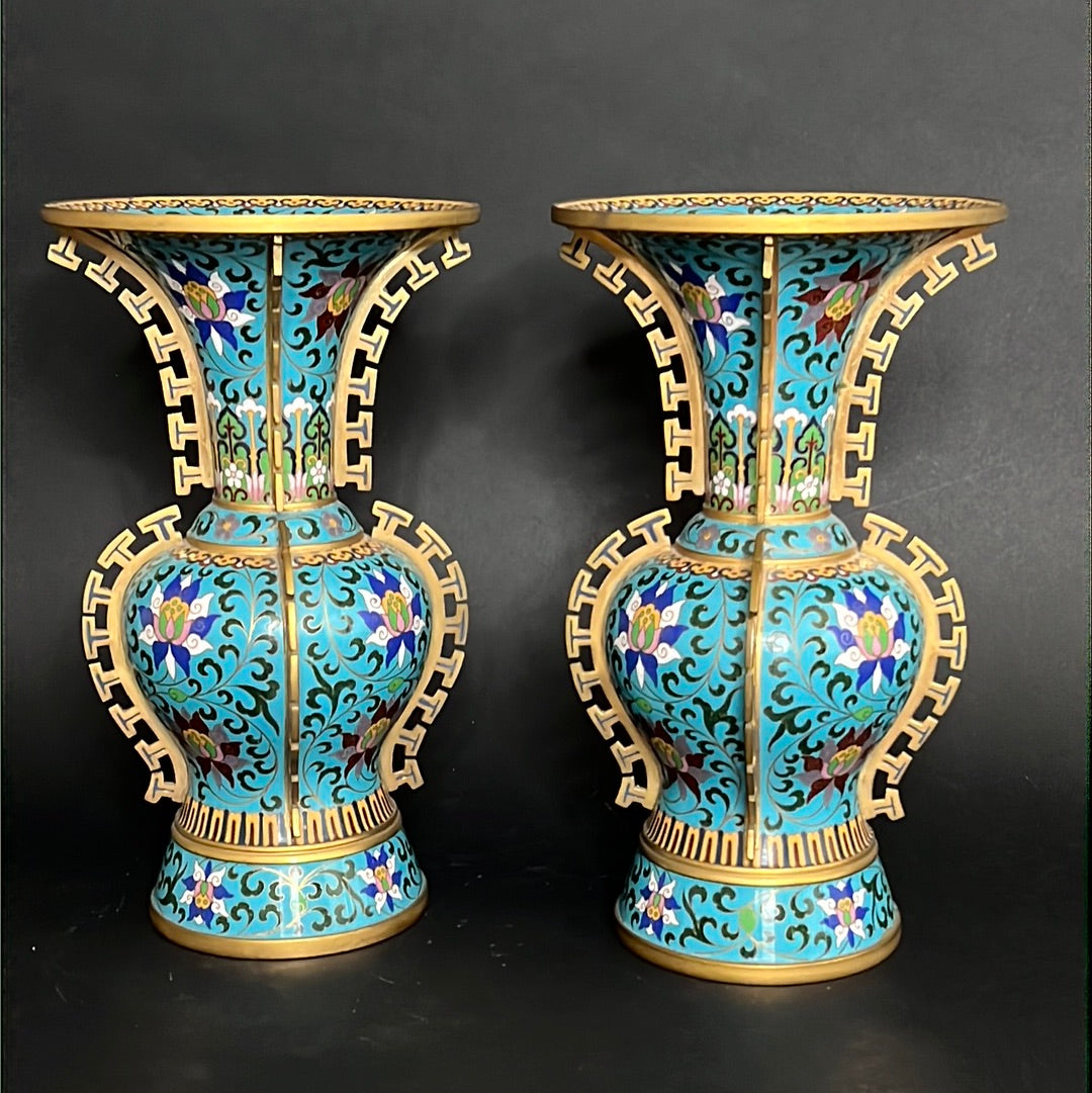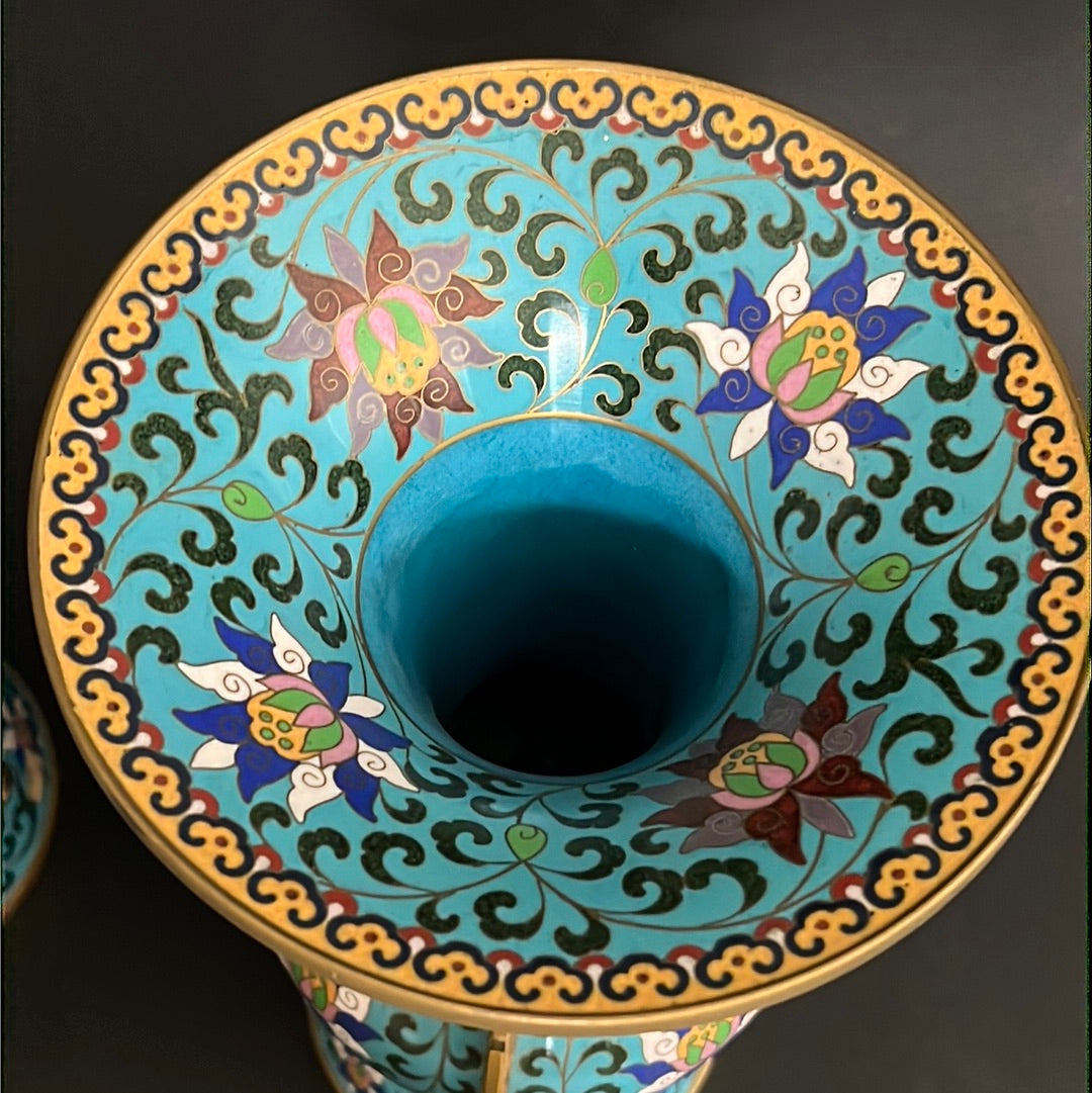 20th C. Rare Pair Chinese Cloisonné Gu Shape Vase