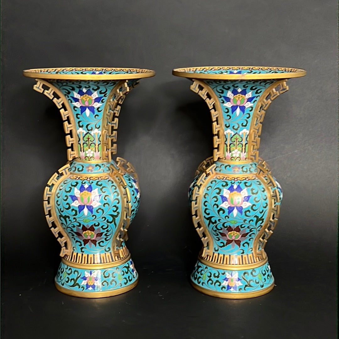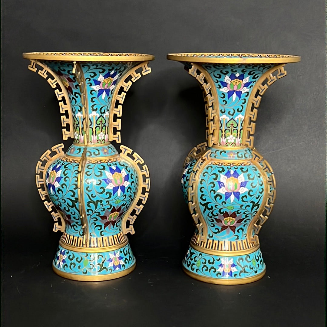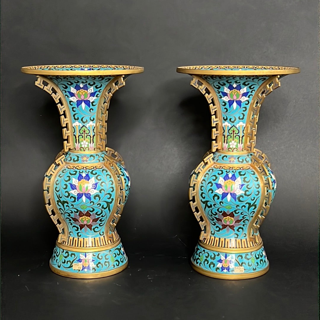 20th C. Rare Pair Chinese Cloisonné Gu Shape Vase