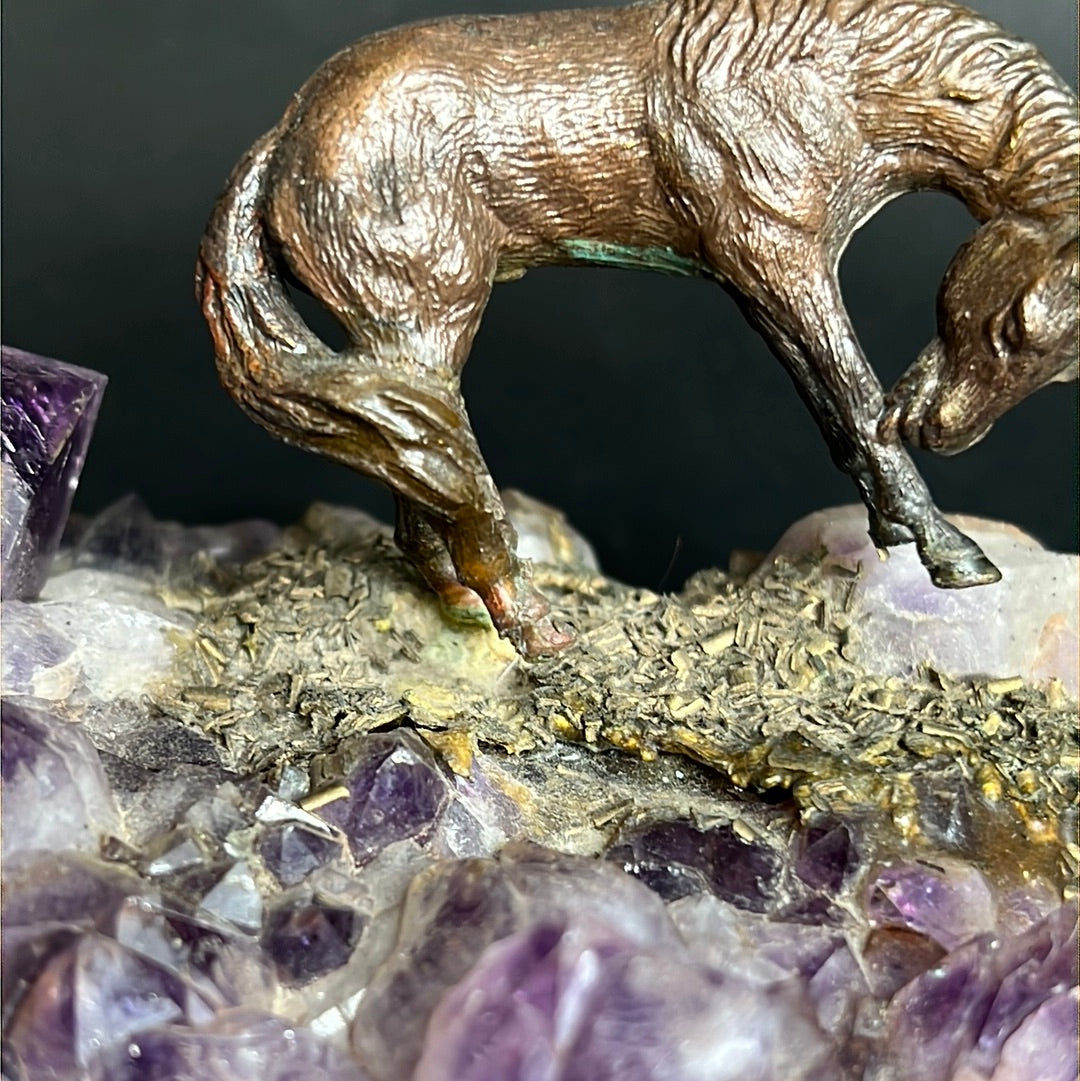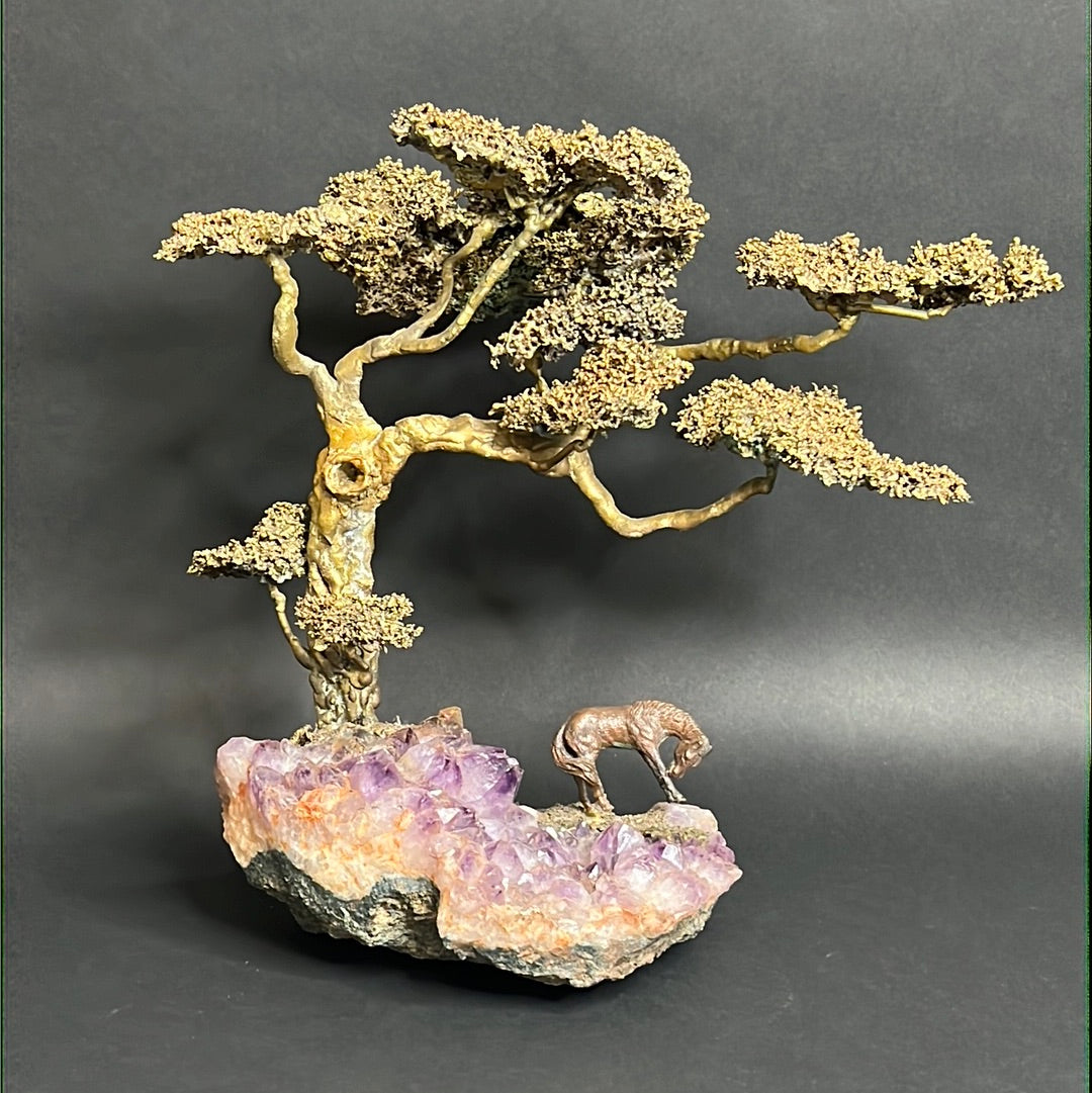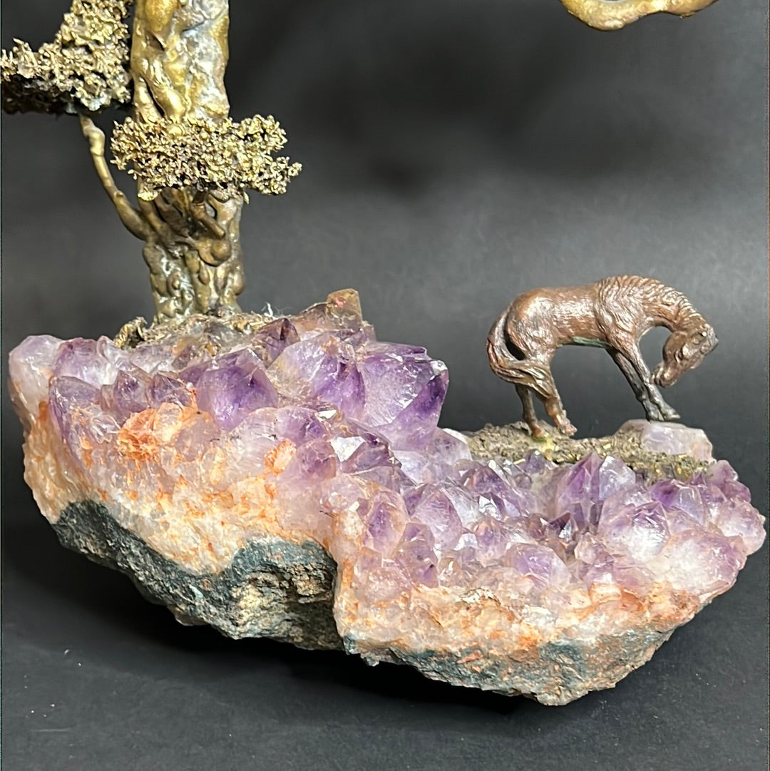 Bonsai Tree Mounted on top of Raw Amethyst Stone with Resting Bronze Horse. Trees looks like clusters of gold.
