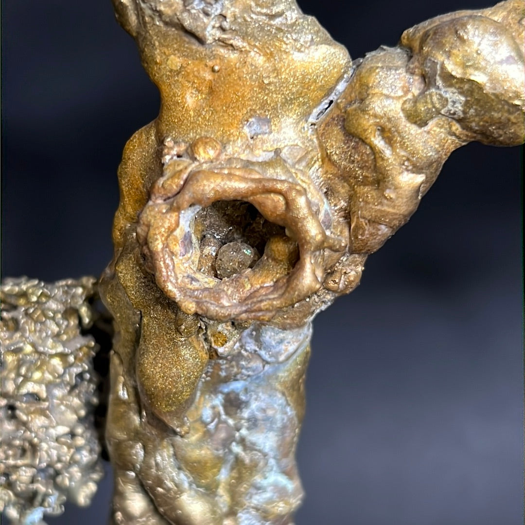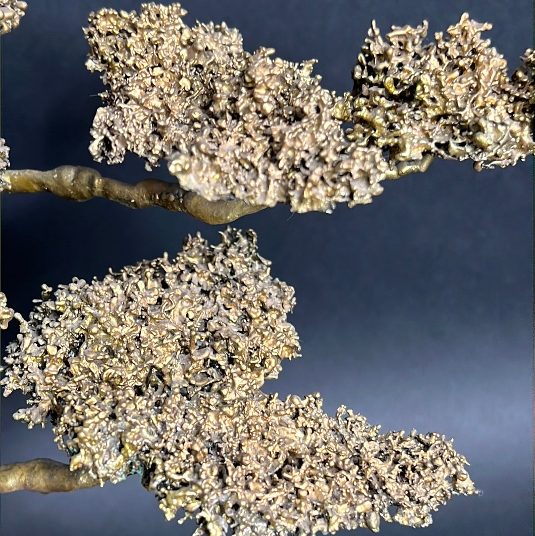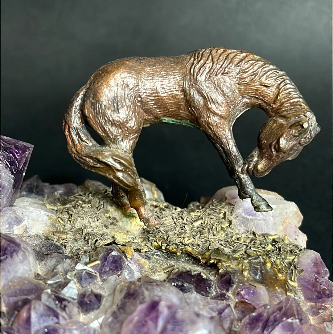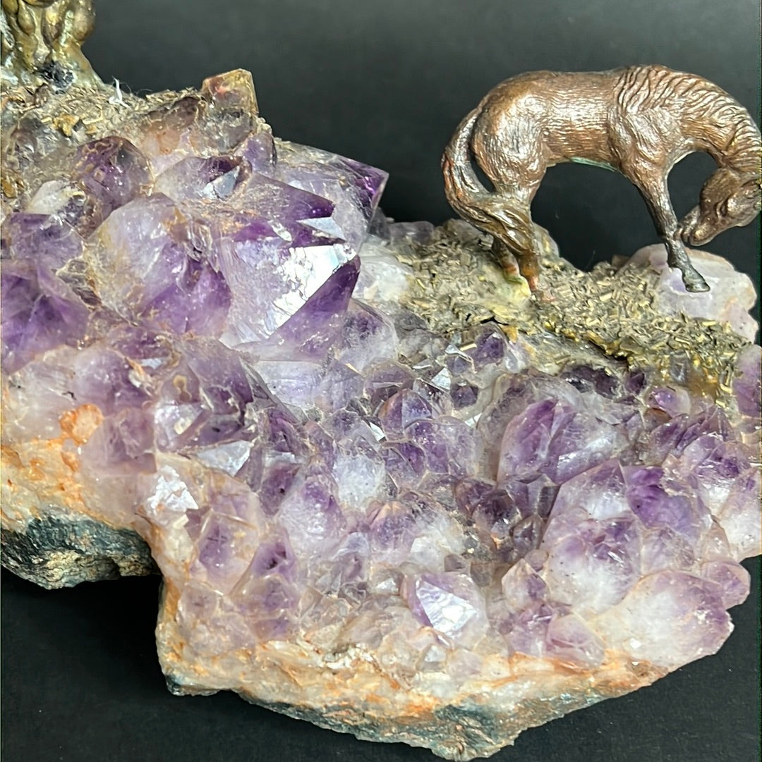 Bonsai Tree Mounted on top of Raw Amethyst Stone with Resting Bronze Horse. Trees looks like clusters of gold.
